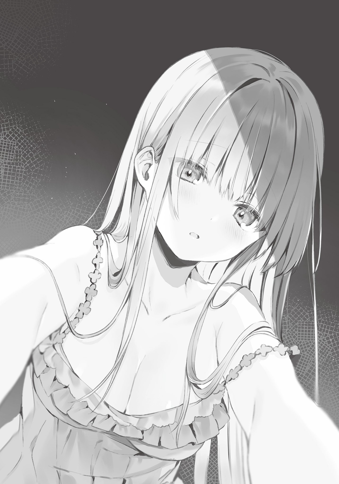 Mahiru se blottit contre lui avec langueur et passa ses bras autour de son dos, réduisant la distance entre eux, les yeux baissés avec timidité. En baissant les yeux, Amane aperçut une parcelle de peau fraîche et nue, habituellement invisible, révélée par l’encolure de sa robe blanche.